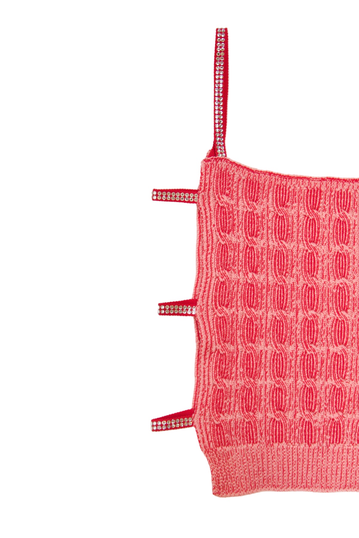 Red and pink tweed pattern tank with sides exposed and rhinestone embellished straps.