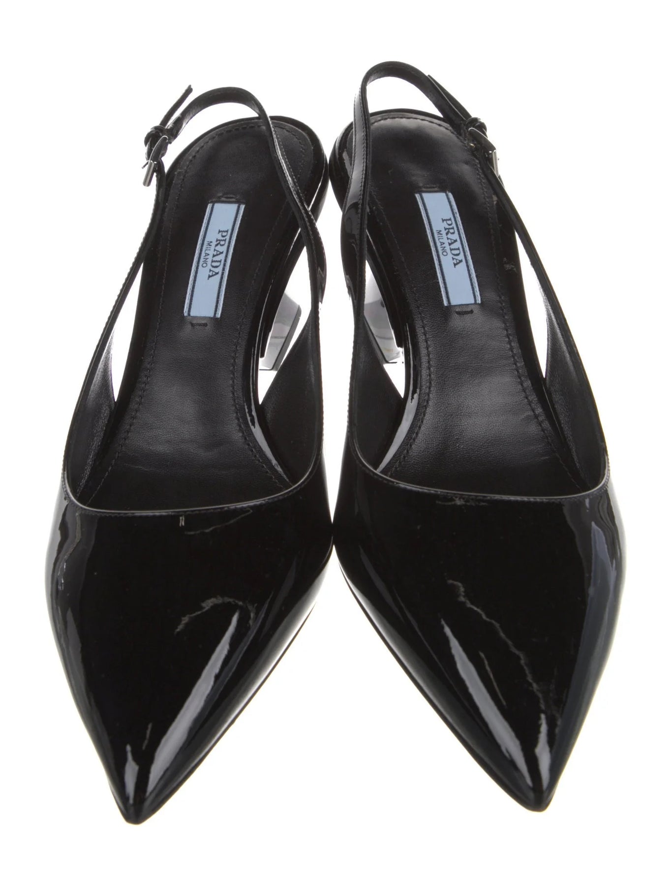 Retro chic are these Prada slingback mule pumps with a white contrasting logo at the base of the heel. They feature a pointed toe, an adjustable ankle strap, and a funky geometric heel to complete the retro look.